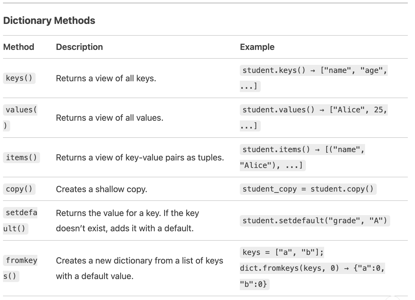 key, value = student.popitem() # Removes ("gpa", 3.8)4. clear()